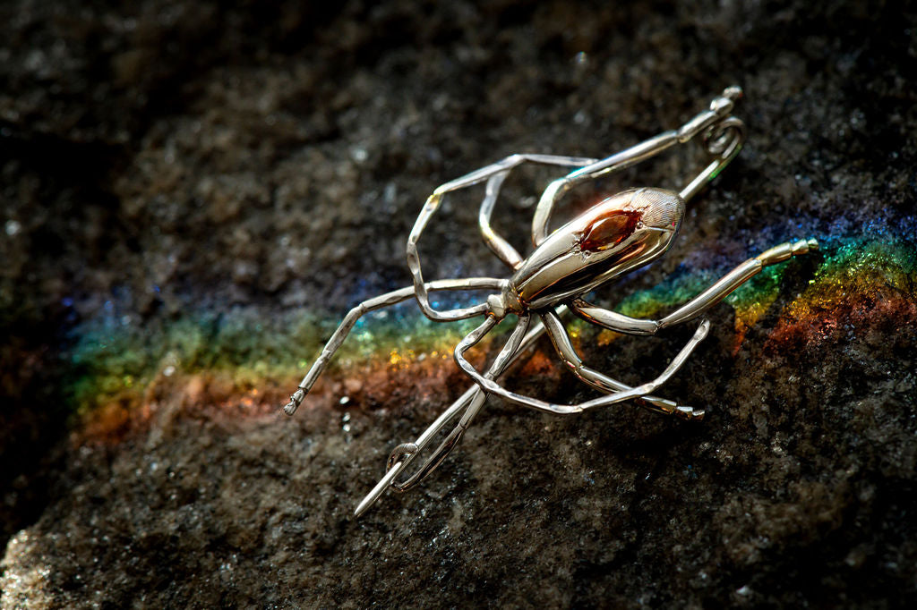 Solid 925 silver hand fabricated and engraved "true" bug set with reddish-brown/ green/ straw yellow andaluscite marquise. The pin back is a fibula-style. This is a one of a kind art jewel. No mold, only one available.